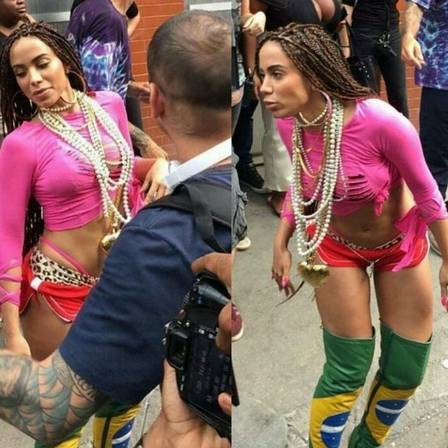 Mais tarde, a cantora trocou de figurino e se deslocou pelo Vidigal na garupa de um mototáxi. Desta vez, Anitta surgiu com longa botas com as cores da bandeira do Brasil, dreads no cabelo e um modelito no melhor estilo periguete, com direito a calcinha à mostra.